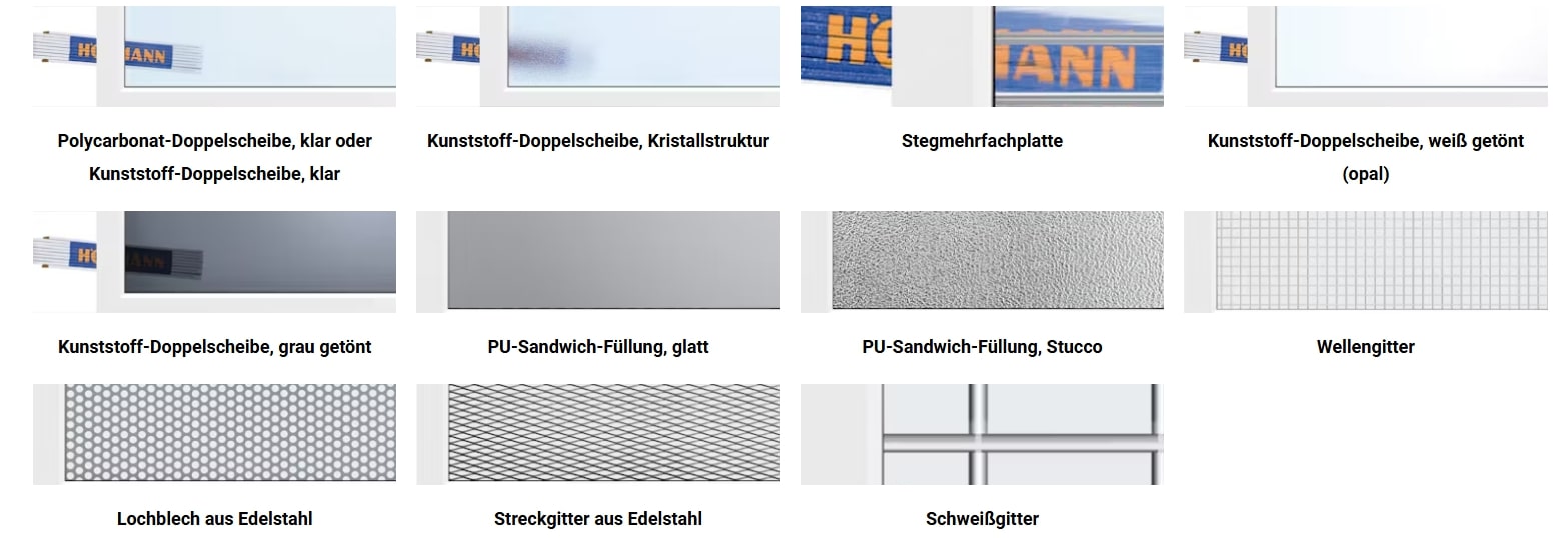 ART 42 (Normalprofil), ART 42 Thermo (thermisch getrenntes Profil für besonders gute Wärmedämmwerte) und ART 42 Vitraplan (flächenbündige, grau getönte Duratec®-Verglasung; Rahmenprofile verdeckt/auf Tiefschwarz RAL 9005 abgestimmt). - Füllungsvielfalt – von klar bis luftdurchlässig: u. a. Polycarbonat-/Kunststoff-Doppelscheiben (klar oder getönt), Stegplatten sowie Gitter- und Lochblech-Füllungen für zusätzliche Belüftung.