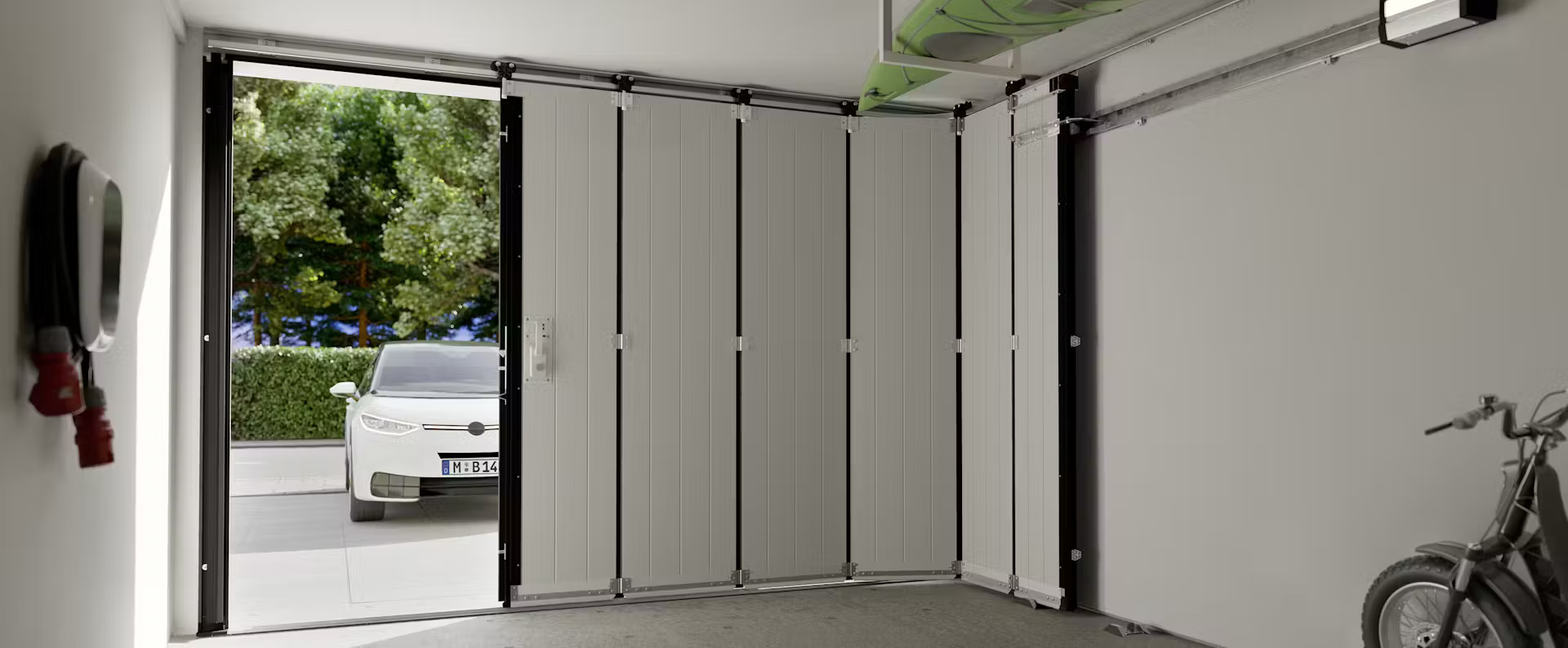 Ein Seiten-Sektionaltor von Hörmann öffnet seitlich entlang der Garagenwand. Im Gegensatz zu klassischen Sektional- oder Schwingtoren bleibt die Garagendecke vollständig frei.