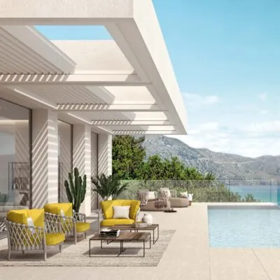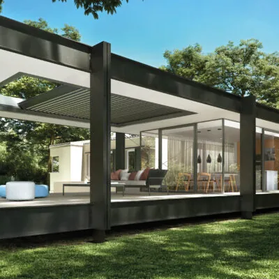 - Einziehbare bioklimatische Pergola: Kipp- und Verdichtungssystem der Lamellen auf Knopfdruck.