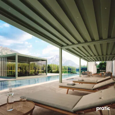 Die Carrera Pergola von Pratic bietet dir ein exklusives Open-Air-Erlebnis mit einer innovativen Kombination aus festen und beweglichen Aluminiumlamellen. Diese Lamellen heben und überlappen sich, um sich der natürlichen Neigung der Sonnenstrahlen anzupassen und so ein angenehmes Klima zu jeder Tageszeit zu schaffen. Die Carrera Pergola fügt sich harmonisch in jede Landschaft ein und bietet dir höchsten Komfort und Vielseitigkeit.
