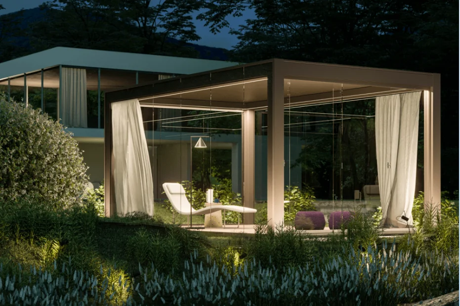 Die Connect verfügt über motorisierte, von 0 bis 140 Grad einstellbare Aluminiumlamellen, eine maximale Modulgröße von 450 cm Breite und 610 cm Tiefe sowie einer Höhe von bis zu 280 cm. Ergänzt wird sie durch verspiegelte oder rauchfarbene Glaswände, LED-Beleuchtung und ein innovatives Regenablaufsystem.