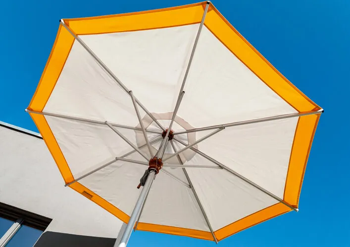 Das eloxierte Aluminiumgestell sorgt für Stabilität und Witterungsbeständigkeit, während die Schirmnaben aus lackiertem Hartholz einen warmen, natürlichen Akzent setzen. Die hochwertige Bespannung aus imprägniertem Acryltuch ist nicht nur wetterfest und pflegeleicht, sondern auch farb- und lichtecht – für dauerhafte Freude an Ihrem Schirm.