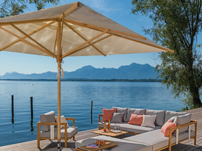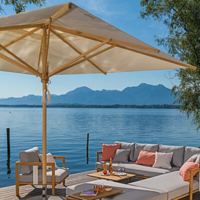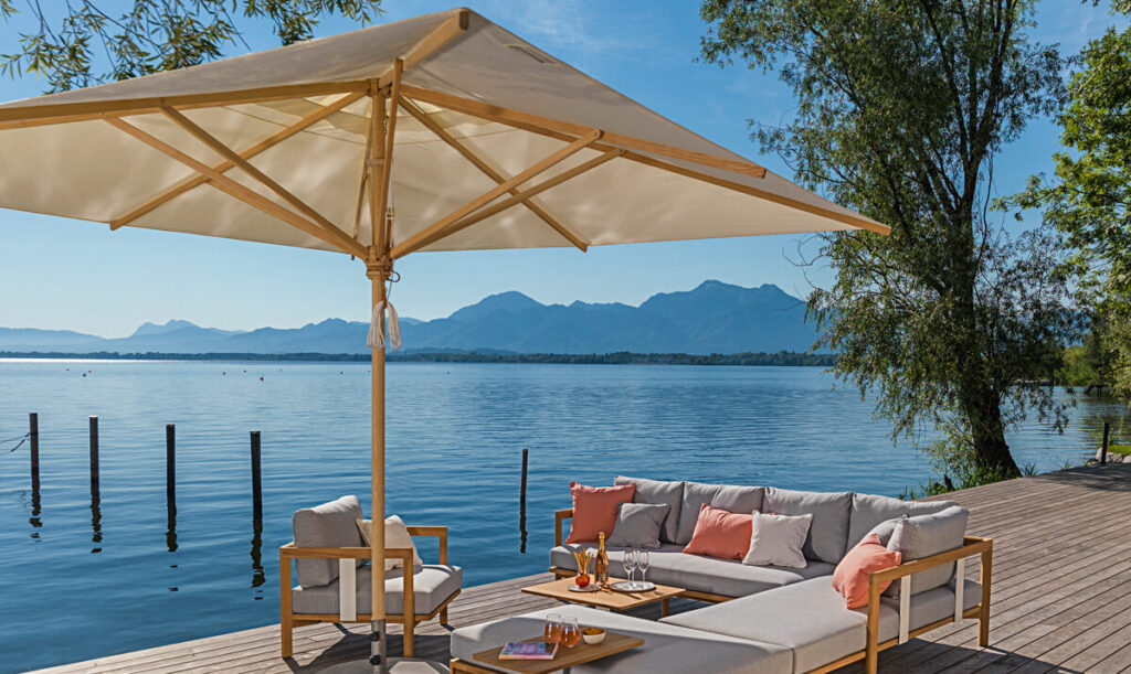 Der Klassiker von Weishäupl ist nicht nur ein stilvoller Blickfang, sondern zugleich ein verlässlicher Begleiter für sonnige Tage. Denn dank seiner robusten Konstruktion aus massivem Hartholz und wetterfesten Materialien trotzt er nicht nur Wind und Wetter, sondern sorgt gleichzeitig für angenehmen Schatten und ein stimmungsvolles Ambiente.